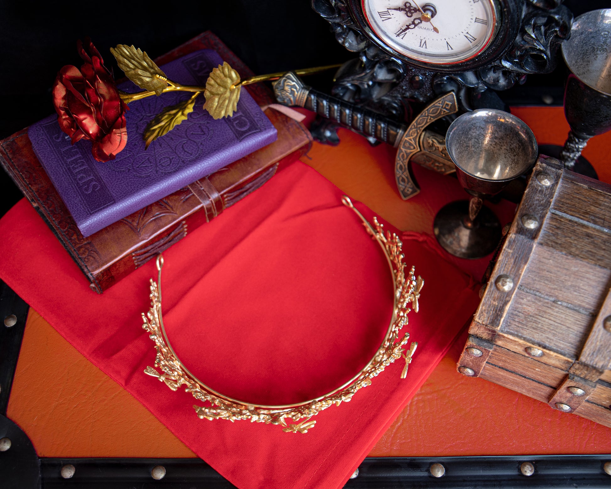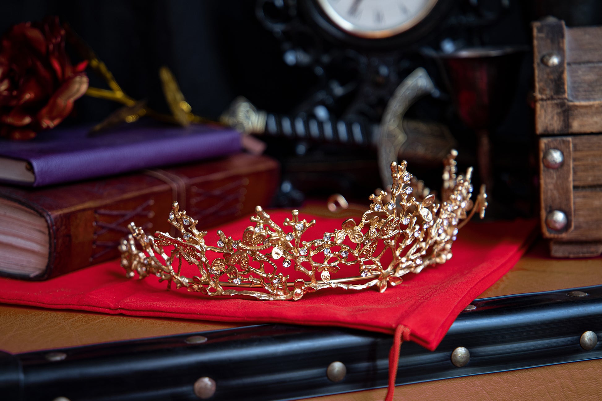 Metal crown decorated with faux diamonds. Made with gold coloured metal shaped to look like branches with additions of dragonflies and flowers.